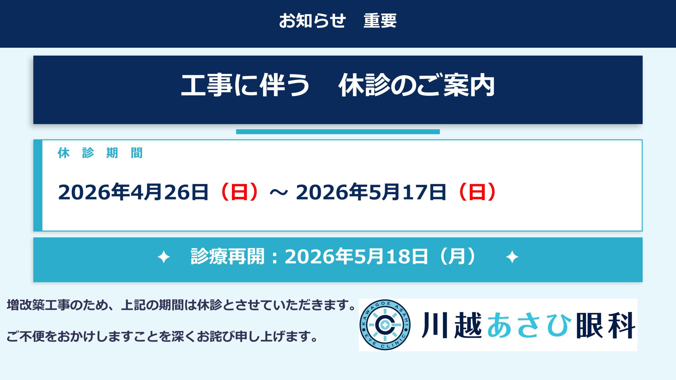 このたび、三重県三重郡川越町豊田一色で眼科診療所【川越あさひ眼科】を開設させていただくことになりました。